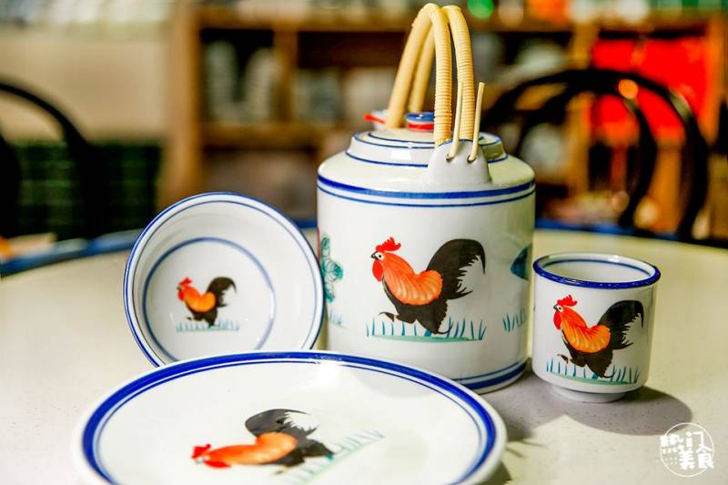 60年代闽南地区的鸡公碗,是出现在TVB剧里的经典道具。白色瓷器上勾勒著几轮青色细线,一只橙红色的大公鸡栩栩如生。“鸡”在闽南语里和“家”同音,所以有“起家”的意思,公鸡也代表旺,有家庭兴旺的意涵,而碗上的“花”则代表花开富贵。