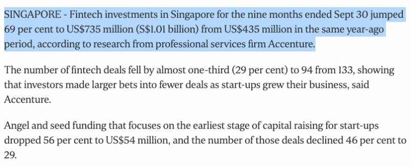 专业服务公司Accenture的研究显示,截至2019年9月30日的九个月,新加坡的金融科技投资从去年同期的4.35亿美元猛增至7.35亿美元(合10.1亿新元),增长了69%。