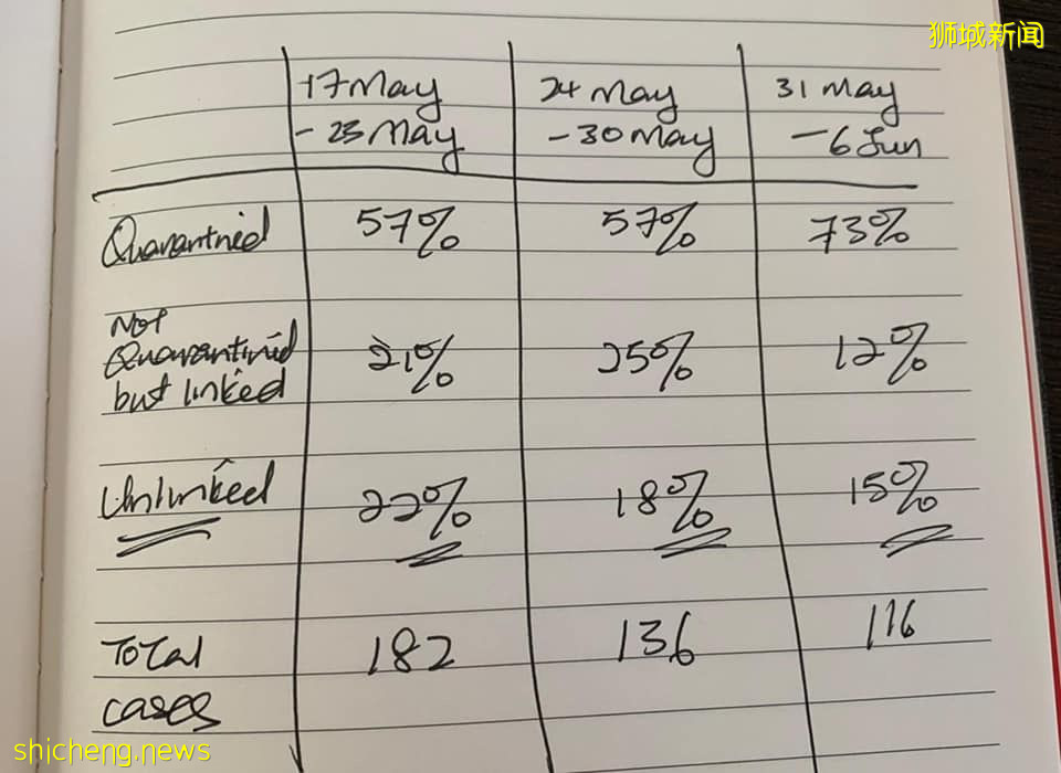 卫生部长王乙康在他的Facebook伤透露,新加坡过去7天的总感染人数比之前一周进一步下降,在隔离期间发现的病患比率从57%上升至73%,无关联的病例从18%下降到了15%。