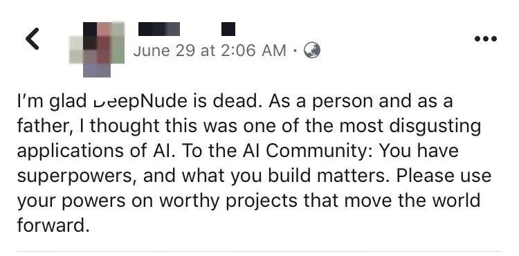 还有网友表示,“幸好现在DeepNude下架了。作为一个父亲,我觉得这是AI技术应用得最恶心的一次。那些可以运用AI技术的人,你们做出来的东西很关键。你们该将这技术应用在更有价值的事情上,从而推动世界进步。”