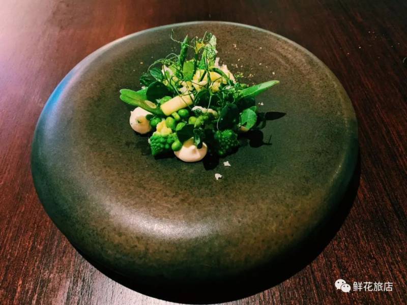 吃饭间隙看到一位小哥在“菜园子”耕耘,不停的拿着镊子夹来夹去,菜品绿意盎然,让我们不禁有些期待。不过作为食物链顶端的肉食动物,我的内心对这道看起来如此健康的全素菜品还是有些担忧的。我安慰自己,它看起来如此繁复精美,然后从asparagus 开始尝起。咦--蛮好吃的,然又尝了尝cauliflower,简直惊艳!和闺蜜对了个眼神,这是道好吃的菜!尤其是其中搭配的Pierre Robert 芝士,是点睛之笔,香而不腻,搭配着清香微甜的时蔬,真的是令人感动的食物!