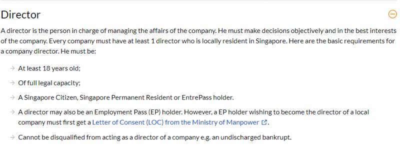 4)董事也可以是就业准证(EP)持有人。但是,希望成为本地公司董事的EP持有人必须首先获得人力部的同意书(LOC)
