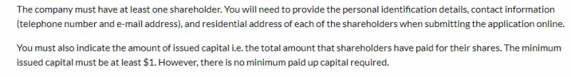 公司必须要有一名股东。注册资本最低1新币起,无实缴资本要求。