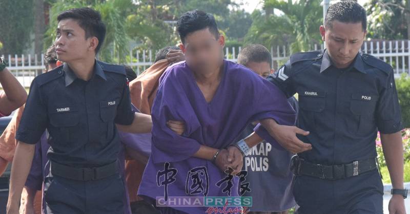 身穿甲中央警区紫色扣留所衣的嫌犯,今早9时50分从警方卡车押送到爱极乐法庭。赤脚的嫌犯似乎负着伤,双手一直按著腹部,行动也缓慢。