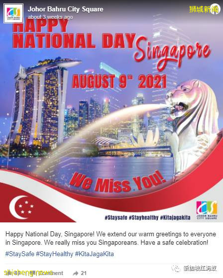 新柔边境封锁一年有余,本月新加坡迎来56岁生日之际,尽管邻国马来西亚军方发布了时机敏感的视频,但彼岸新山的一些购物商场还是和去年一样,为睽违已久的我国人民献上祝福,同时不约而同加上一句“我们想念你”(We miss you)。