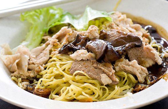 肉脞面:粗蛋黄面配上猪肉丸,猪肉片,云吞,猪肝,还有酥脆的炸鱼干