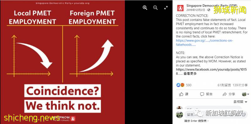 一则附上上述文章连结,以及附有本地白领工作人士(PMET)就业率下降图表的面簿。