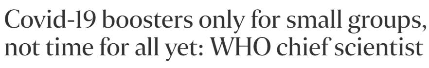 但世卫组织首席科学家则并不这么认为,认为只有少部分人需要接种加强针。