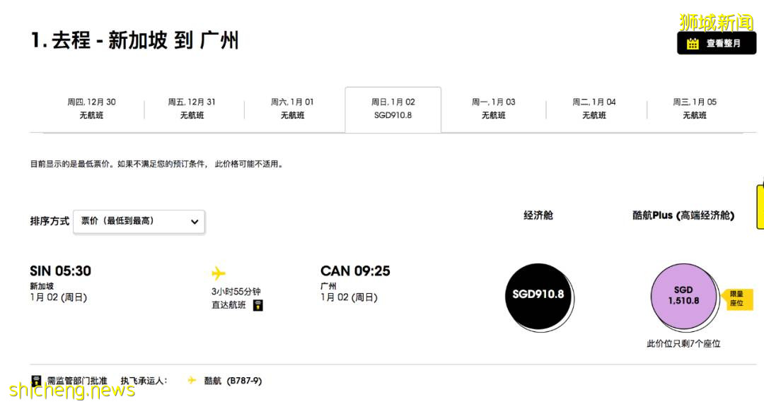 我跟我老婆打算明年春节回国,日期都打算好了。1月31日就是除夕,要赶上团圆饭就得定1月初的票。 到酷航上看了一下,飞广州的1月初就2个航班,1月2号跟9号,机票也比平时贵很多啊,一个人单程910新币。