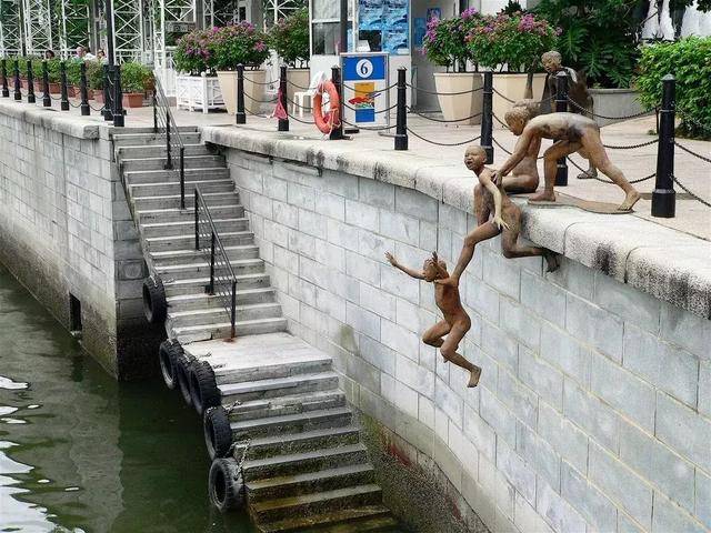 沿着河走到著名的加文纳桥Cavenagh Bridge,这座建造于1869年的吊桥在苏格兰完工,并送来新加坡组装,隔壁就是由老邮政局改造而成的浮尔顿大酒店the Fullerton Hotel。不要错过这里几个有趣的街头雕塑,包括跳水小孩及特别难找的新加坡猫,它们生动地呈现了新加坡河的一段历史。然后就可以走到鱼尾狮雕像与游客们拍“到此一游”的照片了。
