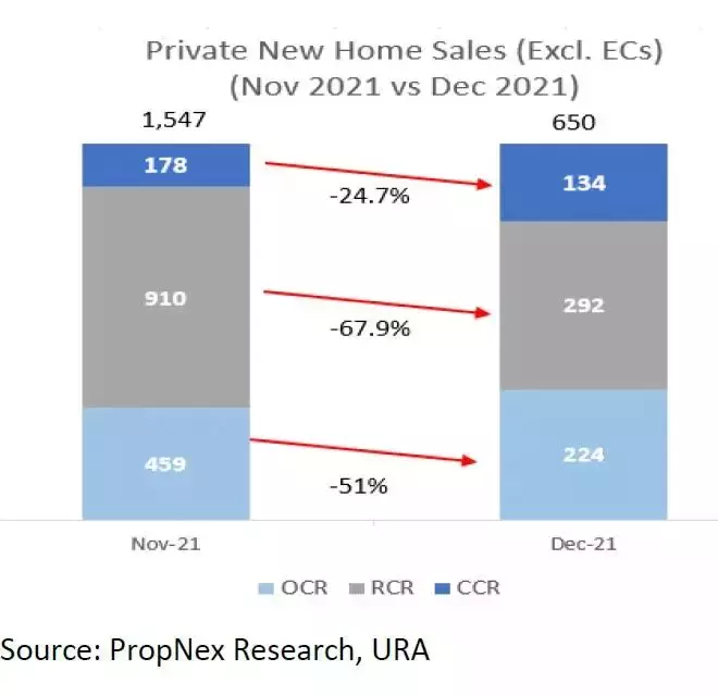 开发商在2021年12月售出了650套新住宅单元(不包括行政公寓),比11月售出的1,547套下降了58%。