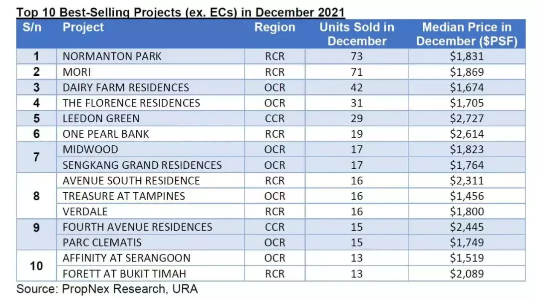 12月最畅销的项目是位于RCR的Normanton Park,以$1,831的中位尺价售出73个单位。