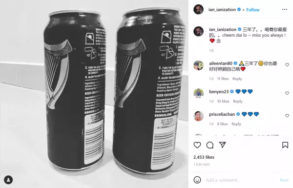 方伟杰则是用啤酒来悼念冯伟衷。他在IG上传2罐啤酒,写道:“三年了,喝着你最爱的,cheers dai lo(干杯),miss you always(一直想念你)!”