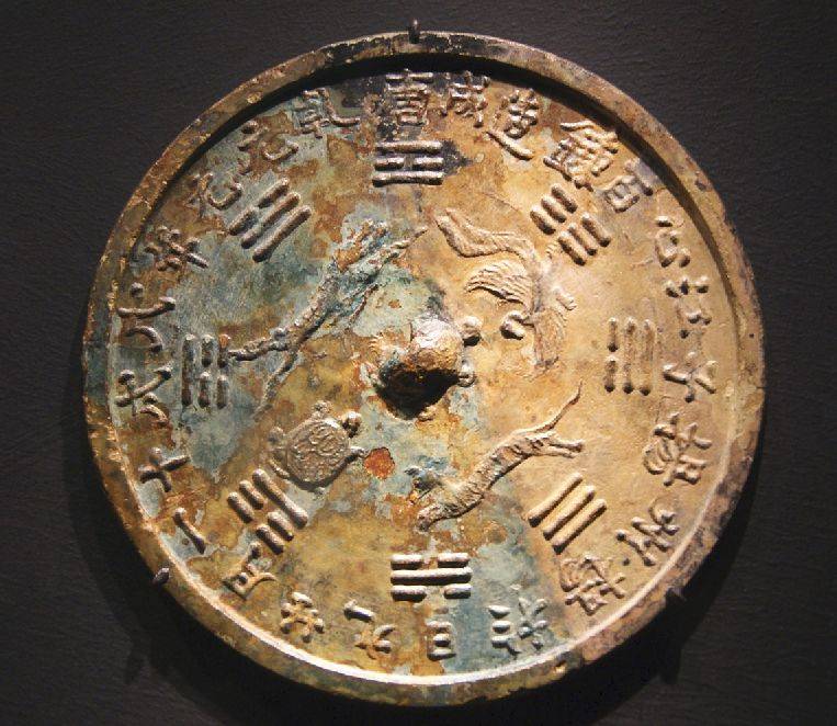 铜镜上铭文为“唐乾元元年戊戌十一月廿九日于扬州扬子江心百炼造成”,镜面还有四大神兽和八卦纹饰。铜镜大约制造于759年。