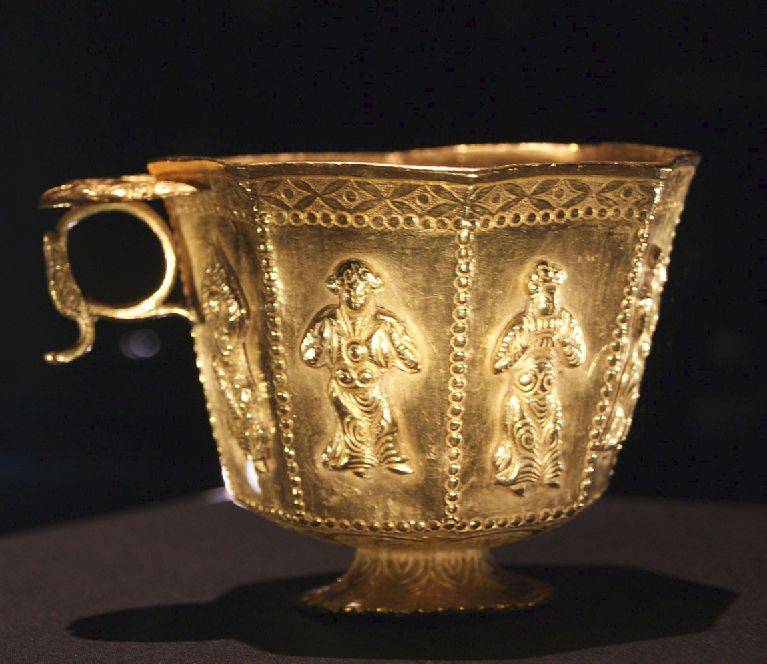 其中有两件极为珍贵的宝物。例如八棱胡人伎乐金杯: