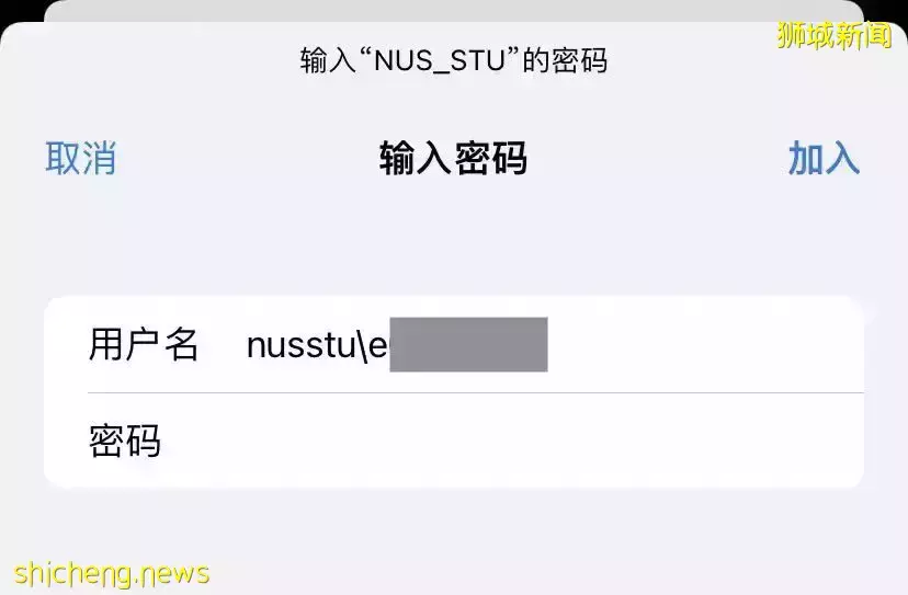 在用户名区域输入“nusstu\”为前缀,后方输入学生本人的NUSNET ID,密码为学生系统的登陆密码,点击加入。