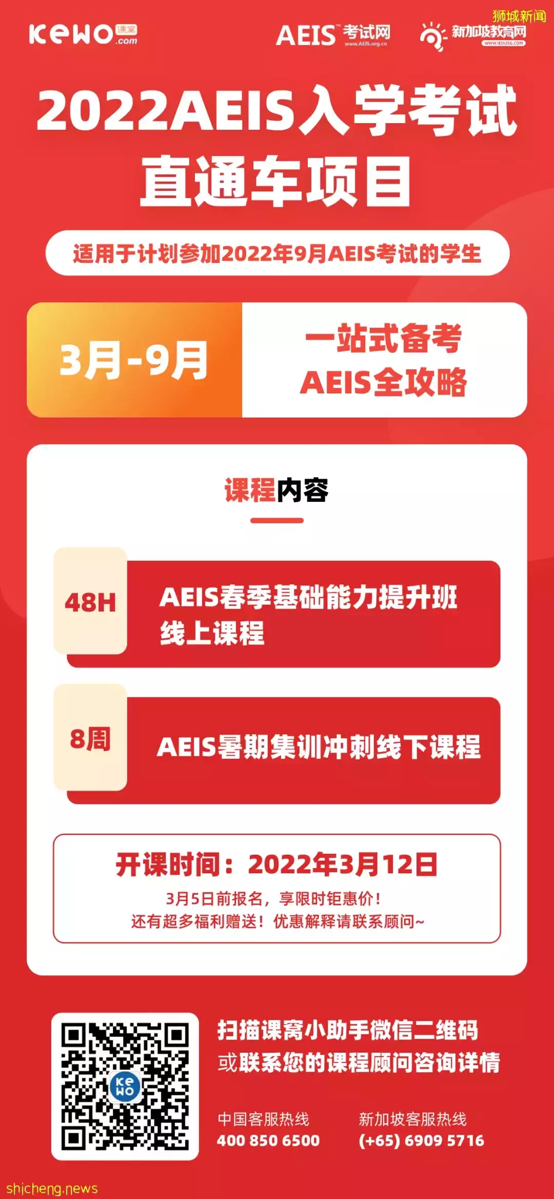为此,我们为大家邀请了往年课窝AEIS录取优秀考生及其陪考家长,让学长分享他的政府学校的学习生活经验总结,以及新加坡陪读妈妈的心路历程,大家千万不要错过哦! 分享会 3月23日晚7点-9点 备战新加坡政府学校PSLE考试的经验分享 新加坡莱佛仕书院在读经验分享 家长陪读及陪考经历分享
