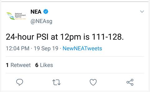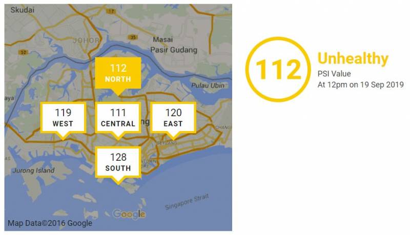 截至中午12时为止,新加坡的24小时空气污染指数(PSI)介于111至128之间: