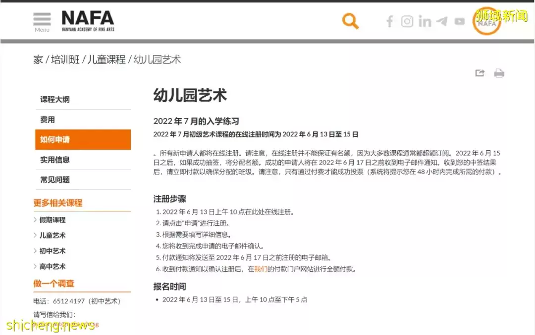 NAFA不同的课程,报名和开课的时间都不一样,如果想给孩子报名,可以随时关注他们的网站,获得第一手报名信息。 网址: https://www.nafa.edu.sg/courses/courses-for-children