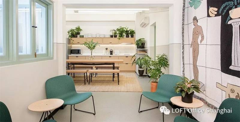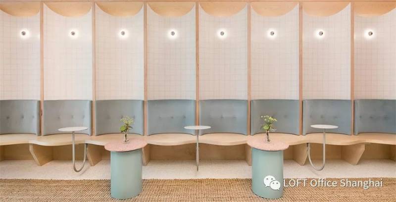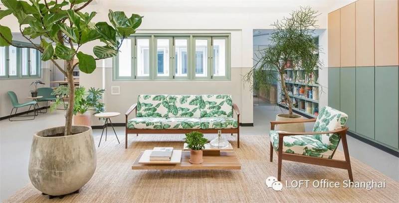 长排的沙发靠背座位区,以亮度较低的绿色系搭配木头,可以让心情沉淀下来。编织技法的座椅则微微带点度假气氛,在脑力激荡时可以喘口气休息一下。