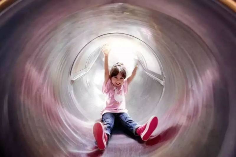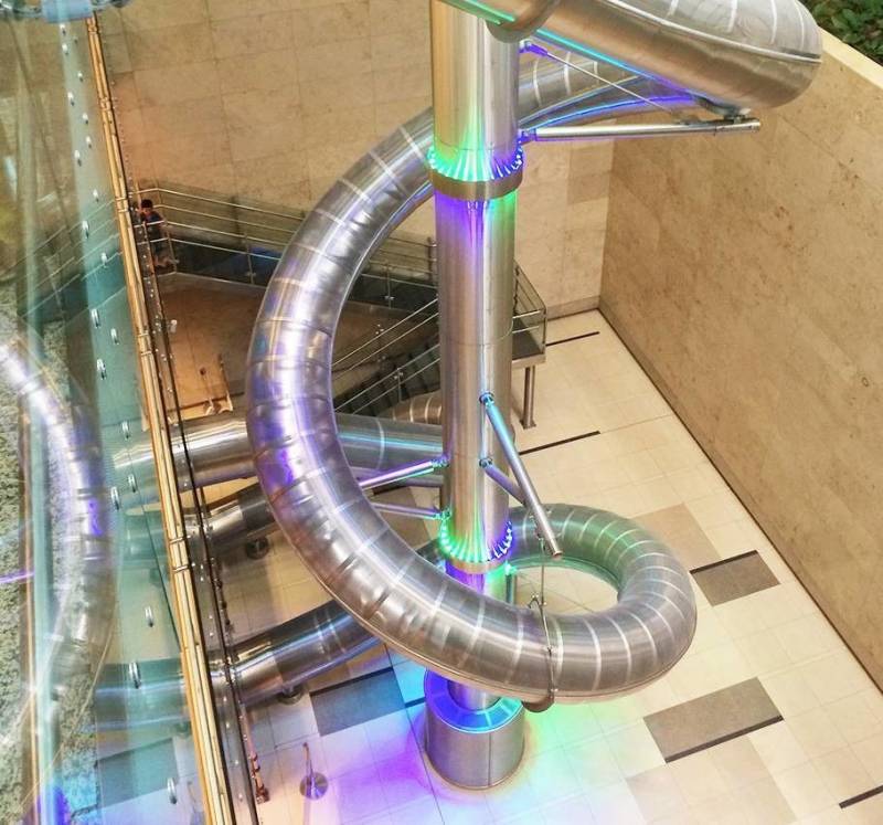 巨大的银色管道充满了科技感,站在4层楼高得地方往下滑,自己好像化身为小黄人,从上而下通往神秘的地方。