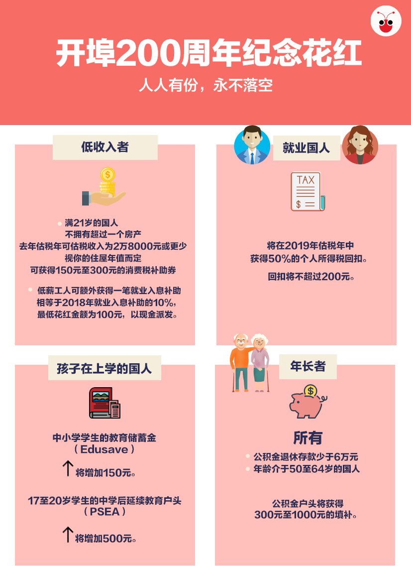 一、开埠200周年纪念花红首先,今年适逢我国开埠200周年,政府推出总值11亿元的花红配套应节,这个配套几乎照顾了所有人,应该是这次预算案中最深得民心的。