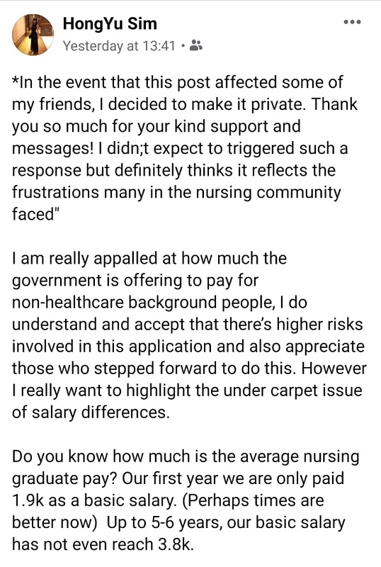 “当局可能会说这是一份临时工作,风险高,福利少,因此需要更高的报酬。那如果我辞去现在的工作,再申请这份工作,我的薪水会不会因为我有一个有11年工作经验的医疗护理学历而更高?如果没有,那么当局想传达什么信息?”