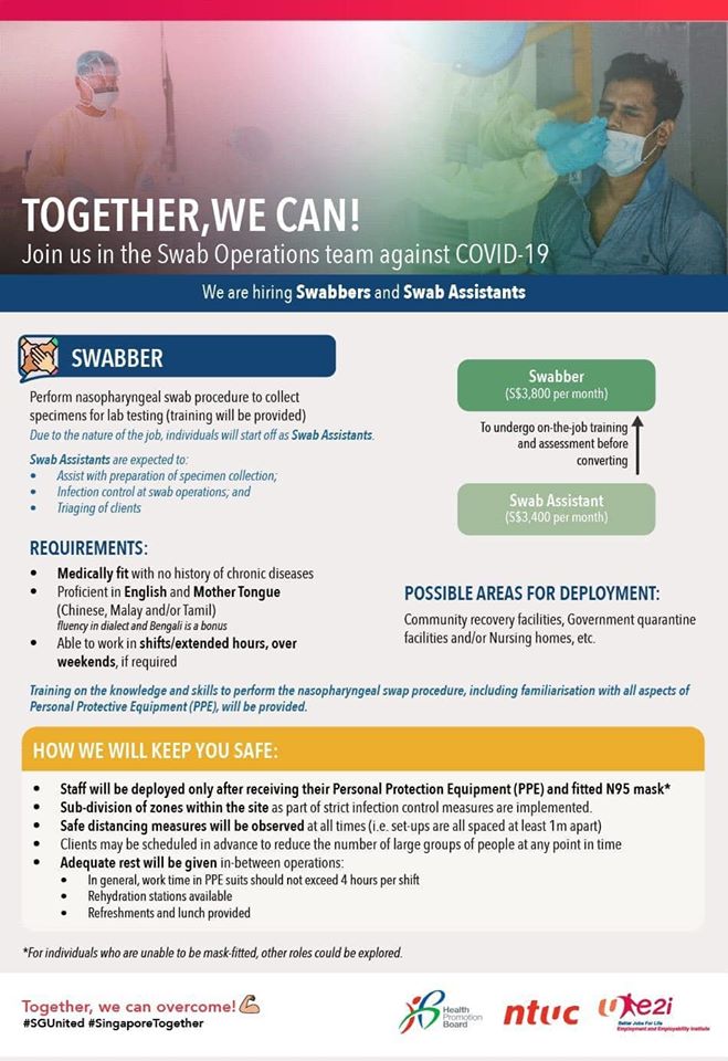 拭子检测助理和人员可能被派往社区康复设施、政府隔离设施或疗养院等工作。每星期轮流工作六天,合约时长六个月,并可延长另外三个月。